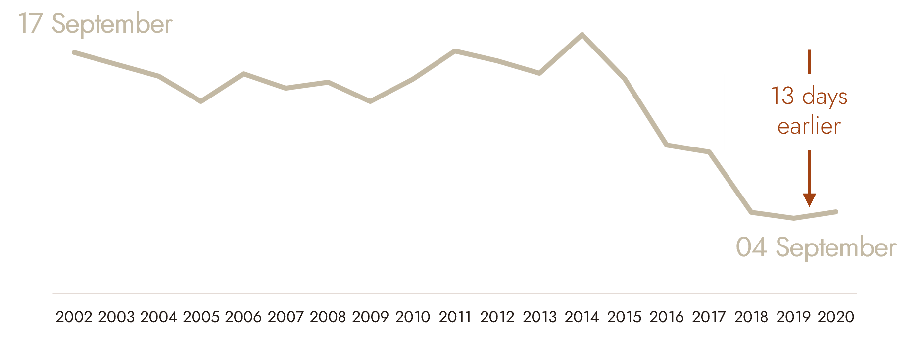 Multiple climatic hazards explain a structural decline in production: Heat waves and drought reduce fruiting, berry size, and photosynthesis, which lowers yields. Advancing phenology increases the risk of spring frost, with harvests starting earlier, as shown in the graph below (Burgundy). Extreme events are becoming more frequent, leading to declines in production:
